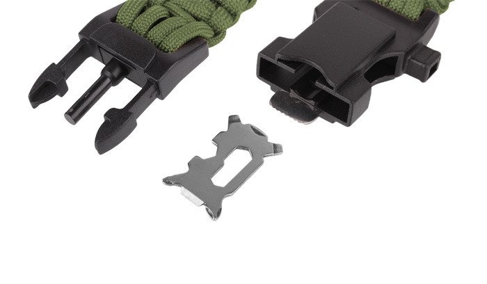 The bracelet has been equipped with a multifunctional composite buckle containing: button compass, thermometer, whistle, flint (rod and plate) and micro-tool.