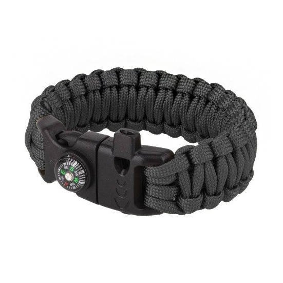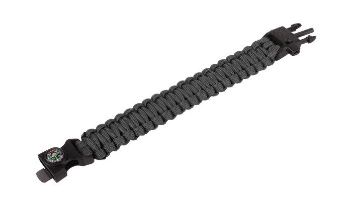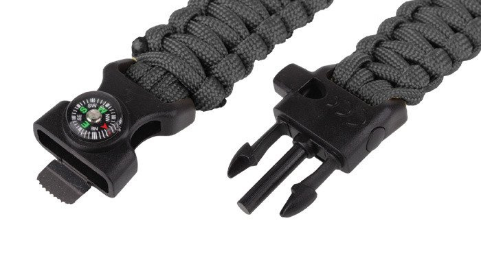 Survival bracelet, the base of which is a polymer snap buckle, on the ends of which is wound a paracord cord. The cord has a core of seven nylon strands, while the buckle on the tip of the trident has a flint rod for rubbing the blade. In addition, a whistle integrated into the buckle and a button compass are still at the user's disposal.