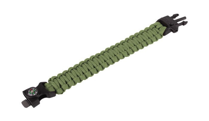 Survival bracelet, the base of which is a polymer snap buckle, on the ends of which is wound a paracord cord. The cord has a core of seven nylon strands, while the buckle on the tip of the trident has a flint rod for rubbing the blade. In addition, a whistle integrated into the buckle and a button compass are still at the user's disposal.