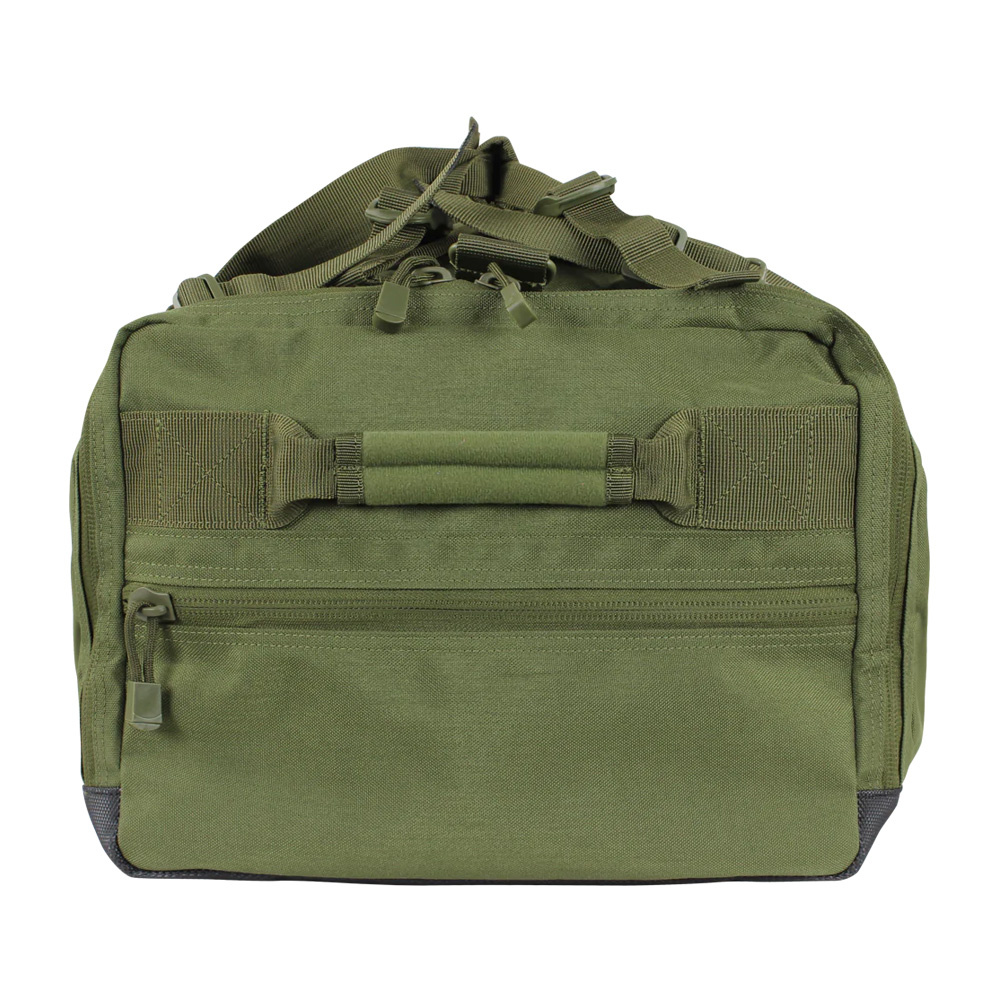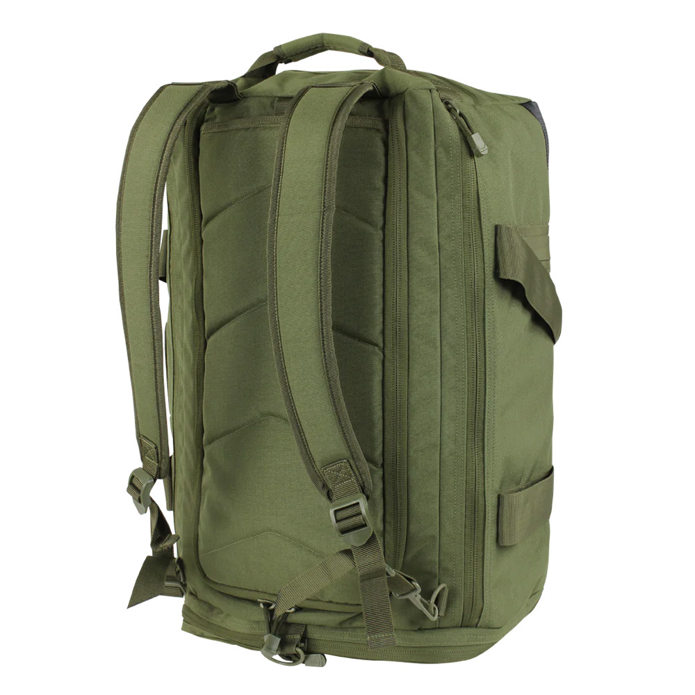 Military bag with a universal design that can be worn on the back or over the shoulder. Closed with a two-way zipper. Equipped with large pockets and compartments for disposing of the carried accessories. Made of polyester, the bottom is reinforced with PVC.
