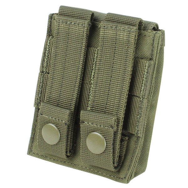 Pouch can be attached to the vest or belt with two vertical straps ion MOLLE/PALS system.