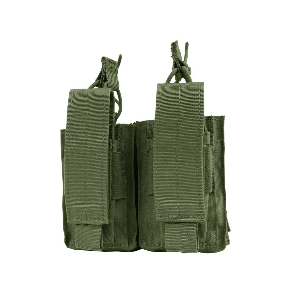 The M4/AR15 magazine is protected from falling out by an elastic cord and the pistol magazine by a Velcro flap. In both pouches drainage holes are placed on the bottom.