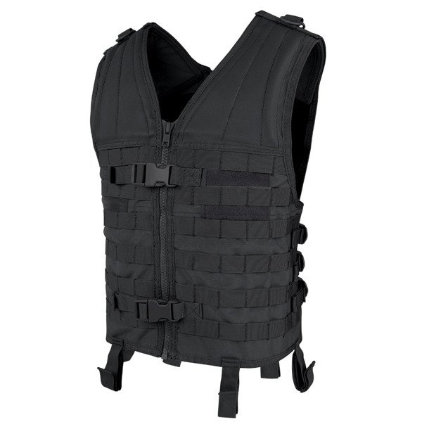 The front and rear panels have MOLLE/PALS compatible webbing for attaching pouches selected by user. Upper part of webbing on chest and back is lined with Velcro for patches.