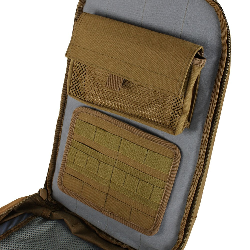 The manufacturer has equipped the backpack on the front with an additional laser cut panel compatible with the MOLLE standard, to which additional accessories can be mounted.