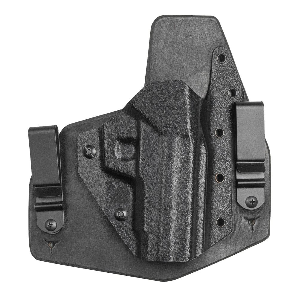 We’ve been through it all – and here is what we think is a best, most comfortable solution: A Hybrid design – with solid bull hide shielding your skin from the weapon and providing carrying comfort while heat molded Kydex shell takes care of proper gun retention, repeatable draw and re-holstering angle.
