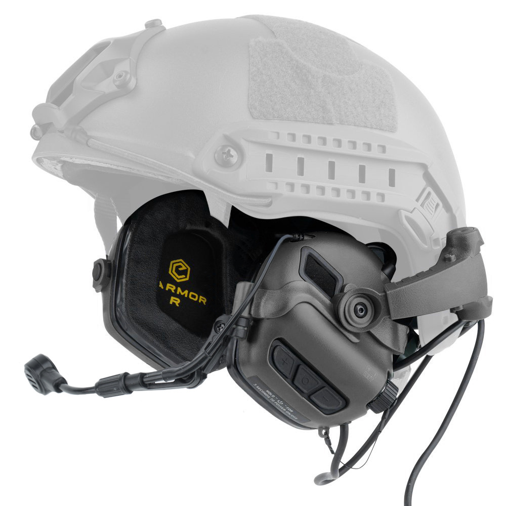 Earmor's active hearing protectors protect against dangerous noise, at the same time allowing you to hear ambient sounds. These are detected by two directional microphones mounted on the outside of each canopy and played back through speakers inside the ear muffs. The ear protectors are equipped with a microphone to facilitate communication with the team.