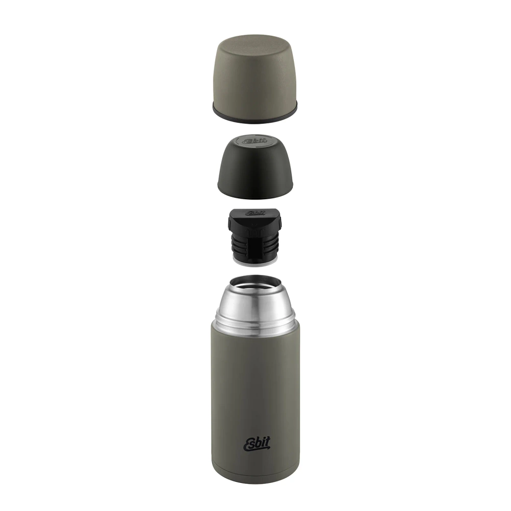 The Classic Vacuum Thermos from Esbit for carrying hot beverages. It is made of 18/8 stainless steel, which contains 18% chromium and 8% nickel. The double wall insulates the beverage being carried, allowing it to maintain its high temperature for a longer period of time. The top lid can be used as a mug, and in addition, it is used to carry a second mug, making it easy to share a warm drink.
