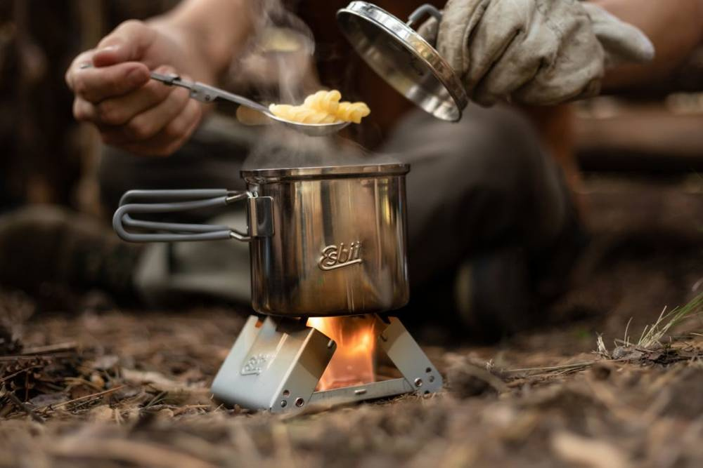 Travel pot with a lid, made of stainless steel. It has an integrated handle, folded for transport. On the outside, there is a capacity scale in ml and oz units. The set includes a lid equipped with a special hook that allows you to hang it on the edge of the pot. It also comes with a cover to protect against scratches during transport.