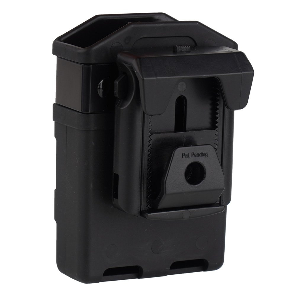 Self-locking universal holder is designated for carrying of absolute majority of metallic or plastic (Magpul, Oberland Arms etc.) magazines. The sophisticated design with the fixation spring enables a quick drawing of the magazine during the so-called combat re-loading. Each user can himself set the desired thrust force of the magazine with use of 3 spacers supplied with the holder.