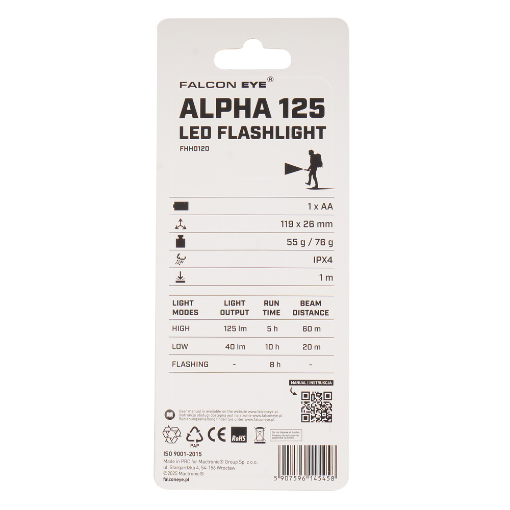 A functional, yet easy-to-use Alpha 125 flashlight with beam focus. Falcon Eye has produced a device that is intuitive to use, yet can quickly illuminate a wide area or a specific point. If necessary, the user still has a Strobo mode with flashing light. The milled aluminum body conceals space for one AA battery in a sealed compartment.