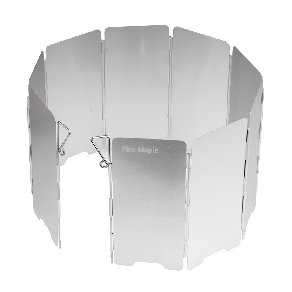 Folding screen for a camping stove made of aluminum panels protects the stove against wind and the surrounding area against splashes and splashes.