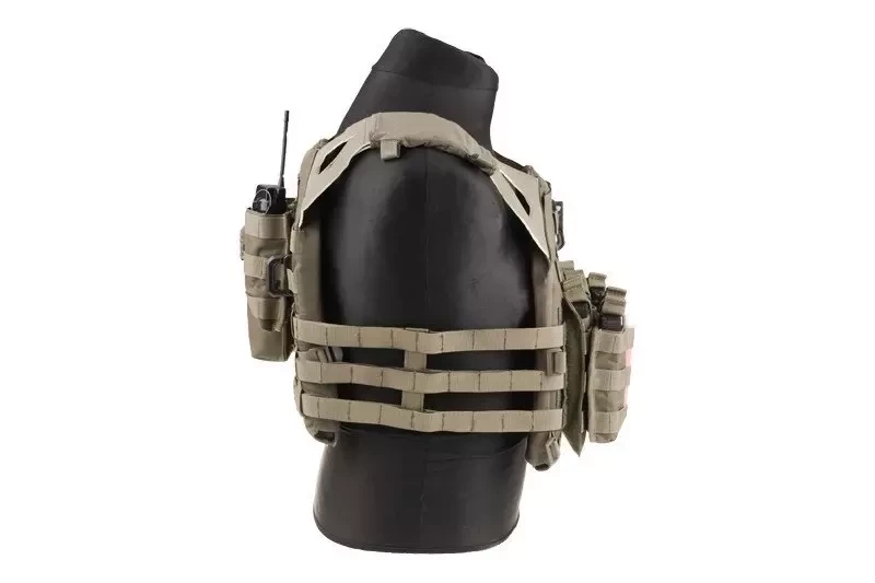 The vest is made of nylon, making it resistant to damage and abrasion. The Plate Carrier design allows it to carry SAPI M ballistic plates, soft dummies of which are included. The built-in loader holds M4/M16 or AK rifles, secured from falling out with elastic straps. MOLLE straps allow additional pockets to be mounted, allowing the vest to be configured according to the user's requirements.