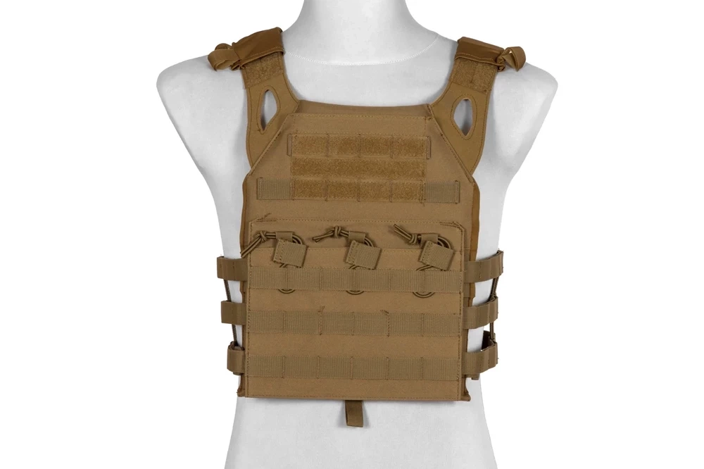 The vest is made of nylon, making it resistant to damage and abrasion. The Plate Carrier design allows it to carry SAPI M ballistic plates, soft dummies of which are included.