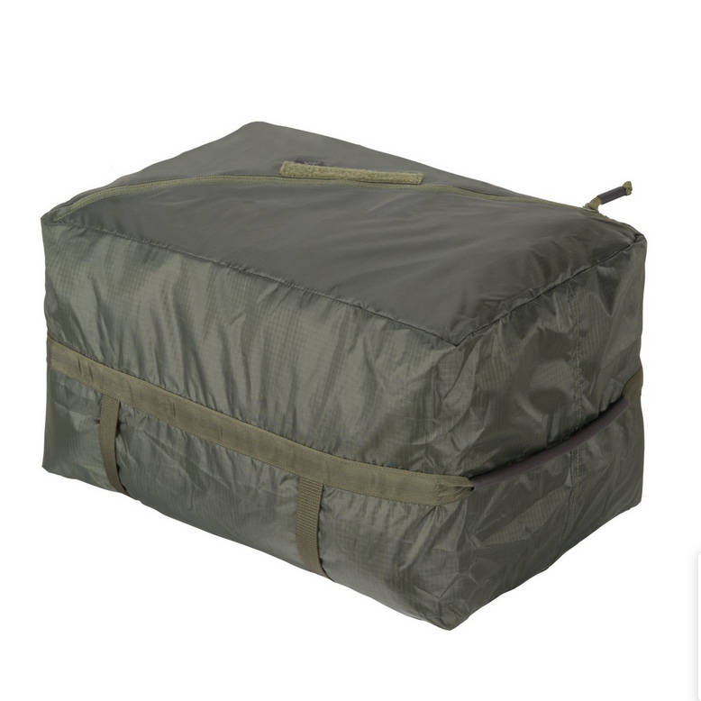 The bag has two drag handles on sides that can be used as hangers. Additionally, the bag has two buckled compression straps to achieve an even more compact size when fully loaded.