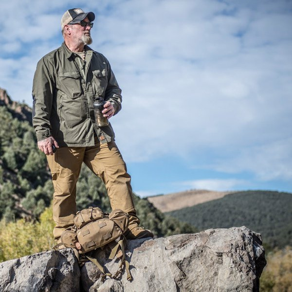 The pants have minimalistic loops for suspenders. Wide belt loops will fit up to 50 mm belts, while additional loops on front allow dummy cording. Additional visual feature are the Helikon-Tex® branded buttons. To provide better protection against small rain, the fabric can be impregnated with special wax.