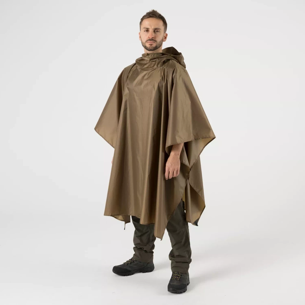 The poncho is made entirely of Ripstop polyester with a distinctive weave. Each of the mounting points has been reinforced to protect against tearing. The cape comes with a pouch with its own drawstring which allows you to keep the folded poncho compact when carrying it in even when wearing a hiking backpack.