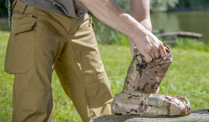 - Two covers enclosed: a drawstring bag and zippered sleeve with mesh bottom for drying, attached to the backpack via nine webbing bands