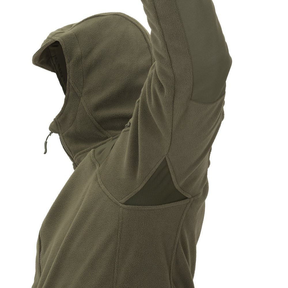 The construction has been thoughtfully designed with an emphasis on durability - reinforcements on the shoulders and elbows with nylon fabric increase abrasion resistance and improve functionality when wearing a backpack. There are mesh panels under the armpits to help improve ventilation. The hoodie can be personalized with Velcro panels located on the sleeves.