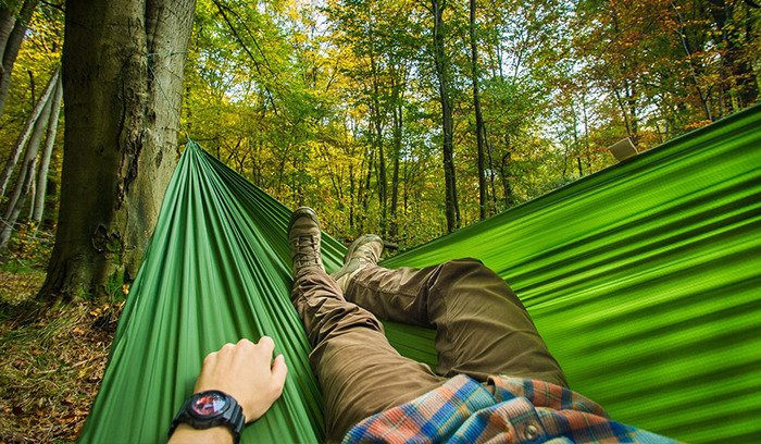 A universal hammock with dimensions of 300 x 150 cm allows a comfortable rest for a person up to 200 cm tall. The hammock is made of a rip-stop polyamide fabric that is more resistant to tearing. The fabric has been pre-impregnated, thanks to which it has greater resistance to dew and light dirt.
