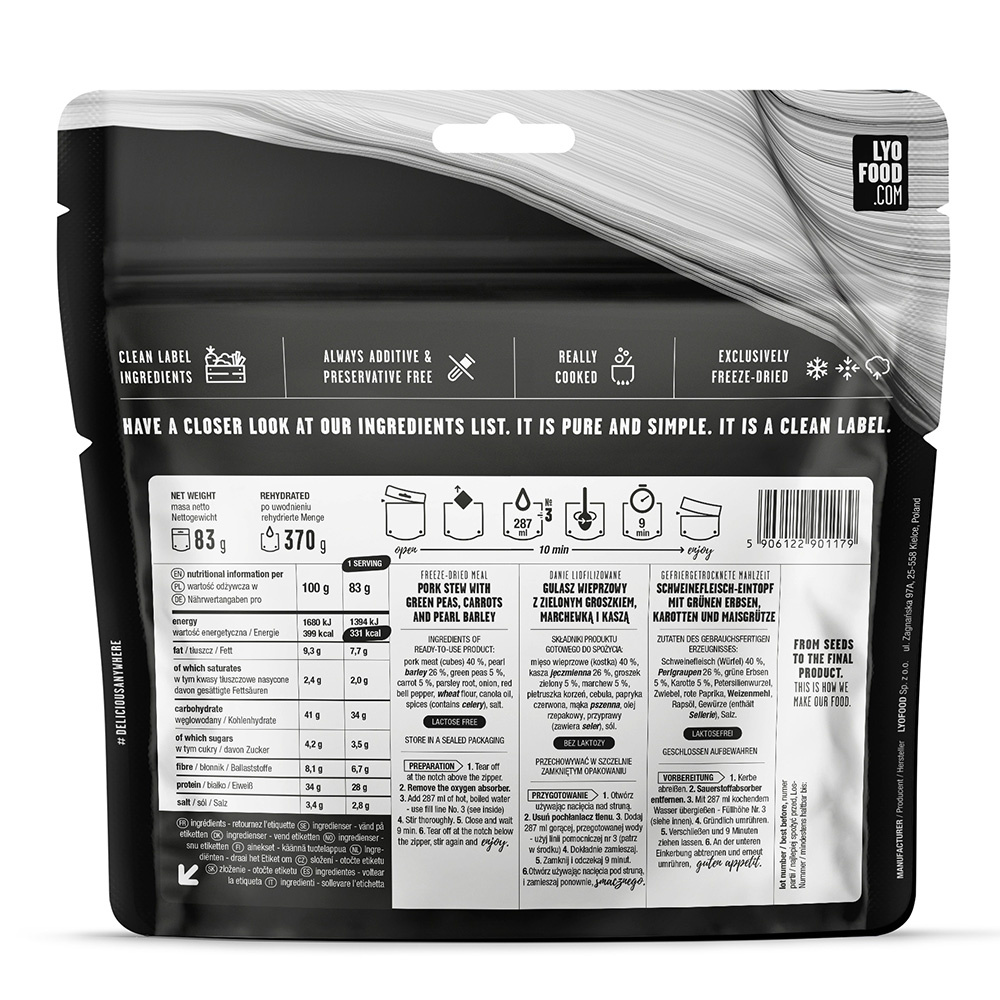 LYO EXPEDITION meals can be stored for a long time. Since the water content is being removed during the freeze-drying process, microorganisms and enzymes action are inhibited. Each pouch is hermetically sealed and contains an oxygen absorber.