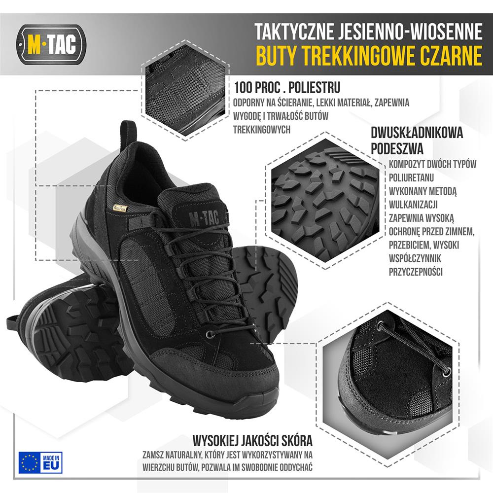 M-TAC tactical autumn and spring boots are suitable for both mountain and urban hiking. They are distinguished by modern style and light weight. Comfortable extended lacing allows for perfect fixing the boot on the leg. The shoes are designed for trekking, running in rough terrain and outdoor activities. They are beautiful, reliable and comfortable modern trekking shoes that fit your feet perfectly and safely protect you from adverse weather and terrain conditions.