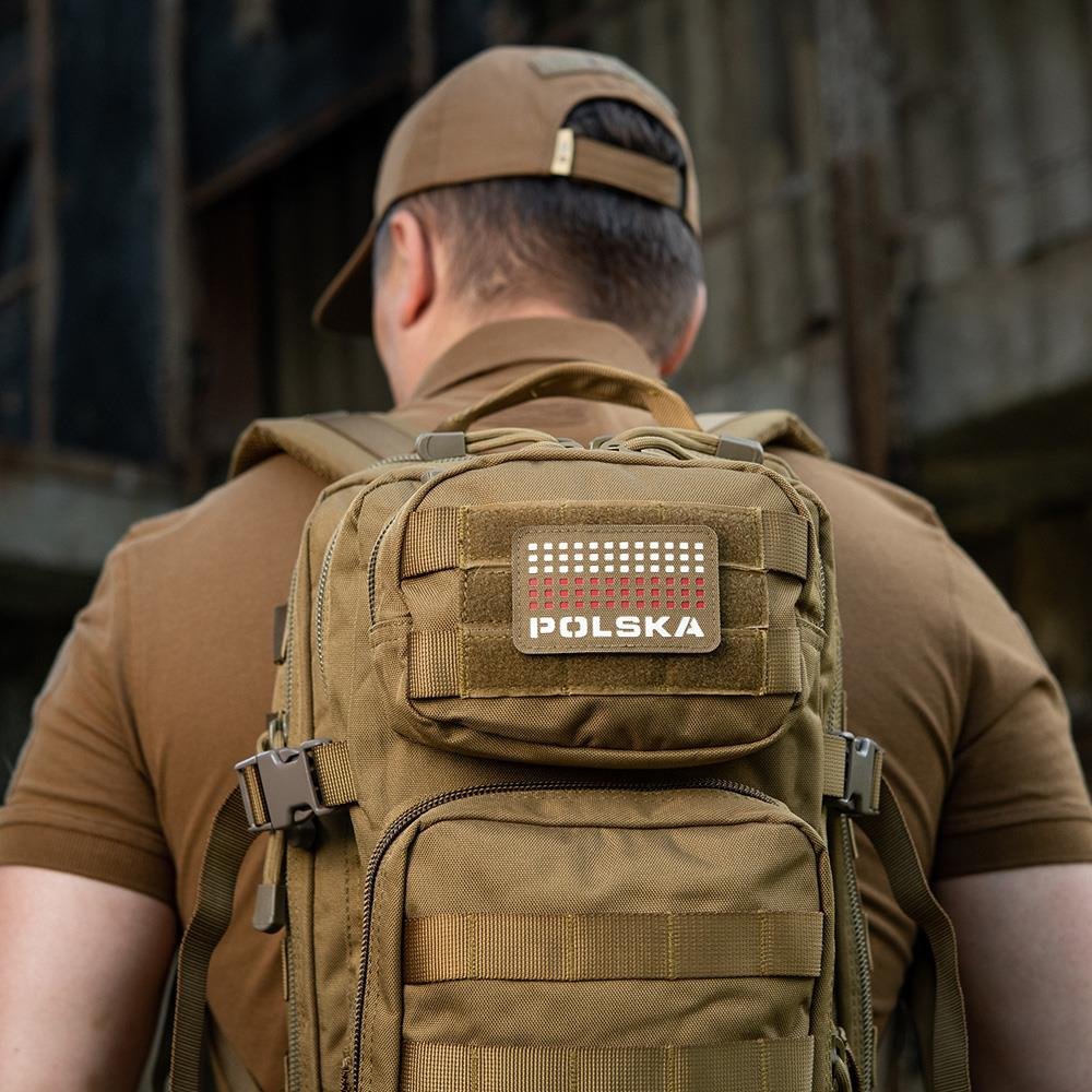The flag patch from M-Tac "POLAND", is made of high quality 500D Cordura. Its dimensions are 50 x 80 mm. With the help of built-in Velcro, we can place it on a baseball cap, sweatshirt or backpack. The patch is designed to identify nationality. The pixelated flag in white and red on a black background was made using Laser Cut technology.