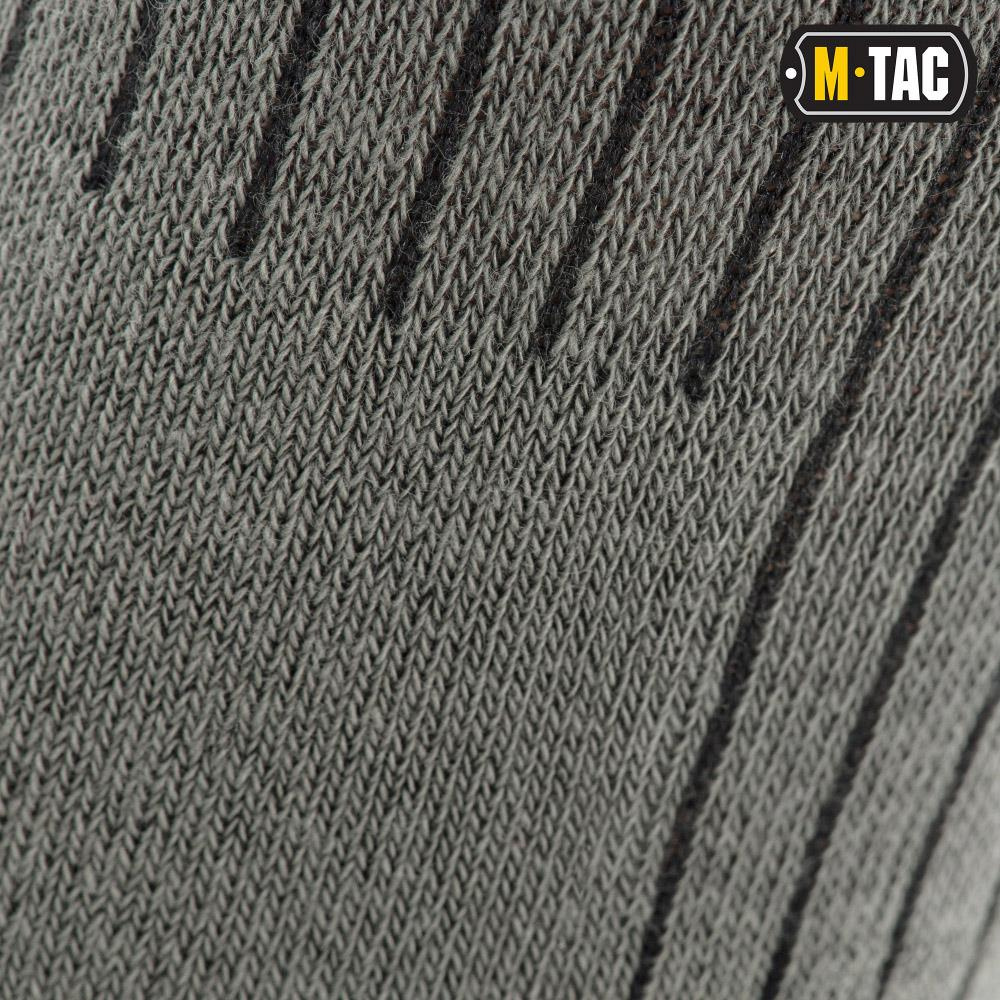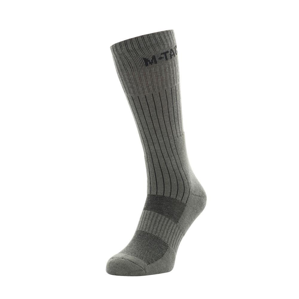 Design features of the M-Tac high sock include special thermal and cushioning zones in the forefoot and heel with transition to the instep of the foot, protecting the ankle from sprains and mechanical stress. To improve performance during heavy walking, a transverse foot arch clip has been added to prevent the sock from rippling at the bottom. A wide welt evenly distributes the load to keep the sock on the shin.
