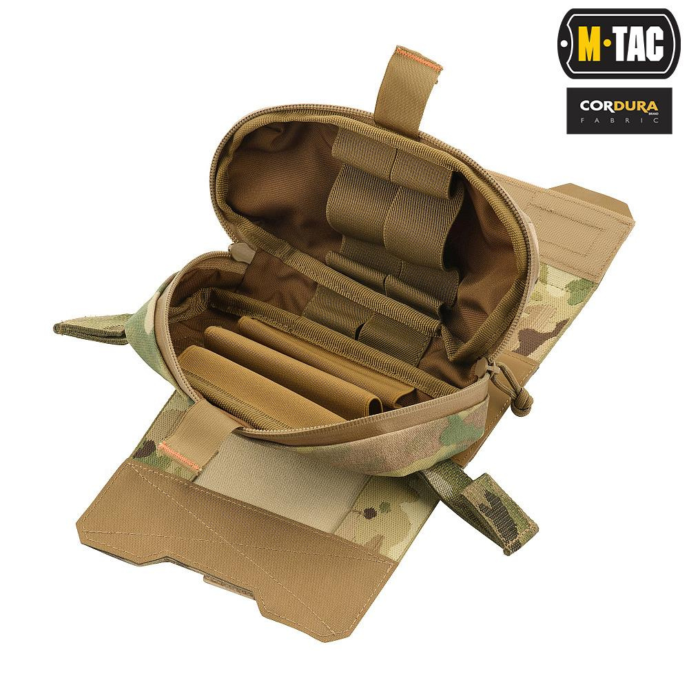Tactical medical pouch Elite from the reputable company M-Tac with an internal organizer adapted to carry a personal first aid kit IFAK. The medical pouch consists of a MOLLE mounting base, which can be attached to the tactical vest or lane and organizer under IFAK. The first-aid kit has the ability to quickly detach the tray in an emergency.