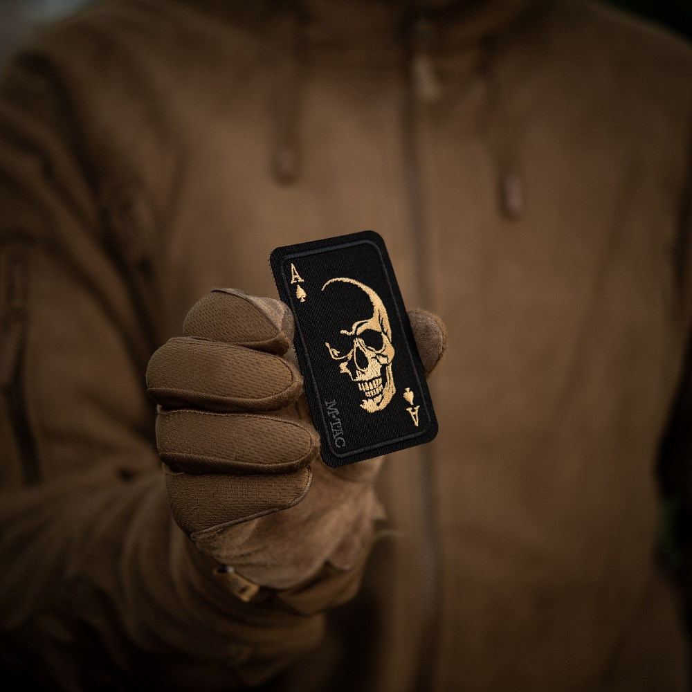 Embroidered Face of War patch depicting a skull emerging from twilight from M-Tac. It was made using the embroidery method on a hemmed Cordura rectangle. The accessory is stylized on the Ace of Spades card, traditionally considered the one with the highest value in the entire deck. Historically, the motif is associated with US Army operations in Vietnam and the Persian Gulf. Velcro hooks allow you to attach the patch to a compatible military backpack panel, for example.