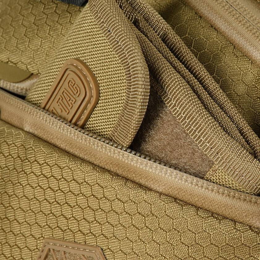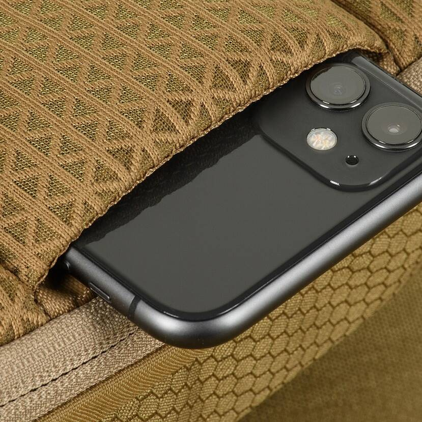 The front pockets are closed with YKK zippers, while the back features a dedicated phone pocket. Side MOLLE webbing allows the user to attach additional gear or a carabiner, and the main compartment has attachments for modular organizers. This allows the user to conveniently organize carried items and have quick access to them.