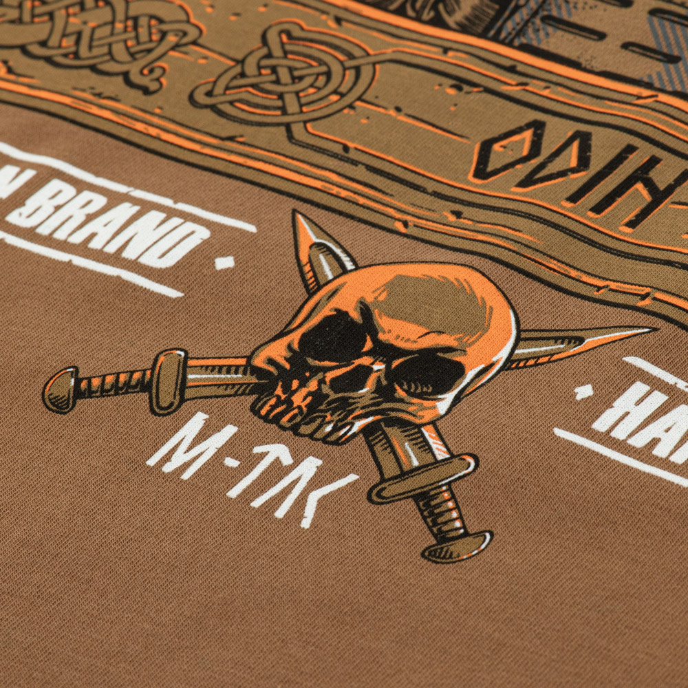 The chest of the T-shirt features a print depicting Odin, the god of war and wisdom, wearing modern battle gear and a helmet with night vision. He is accompanied by ravens Hugin and Munin, symbolizing thought and memory. The print was made using fade- and wash-resistant MagnaColours® inks. It will work well for both everyday and outdoor activities, and can be paired with tactical pants.