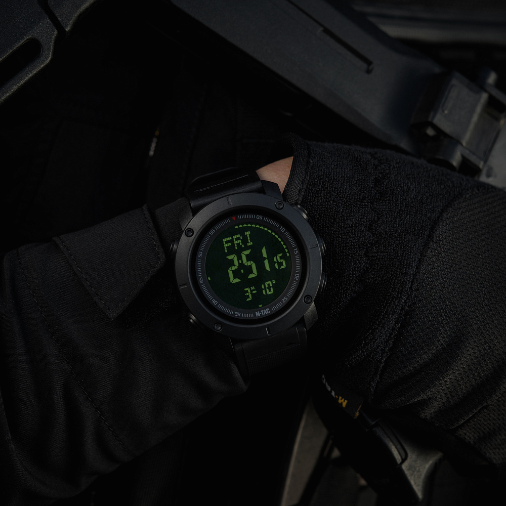 An electronic compass allows for precise orientation in the field, which is crucial in outdoor conditions. The backlit LED display ensures readability of indications even in low light conditions. This model offers additional functions such as a stopwatch, timer, pedometer and alarm. Intuitive operation and large buttons allow comfortable operation of the watch with tactical gloves.