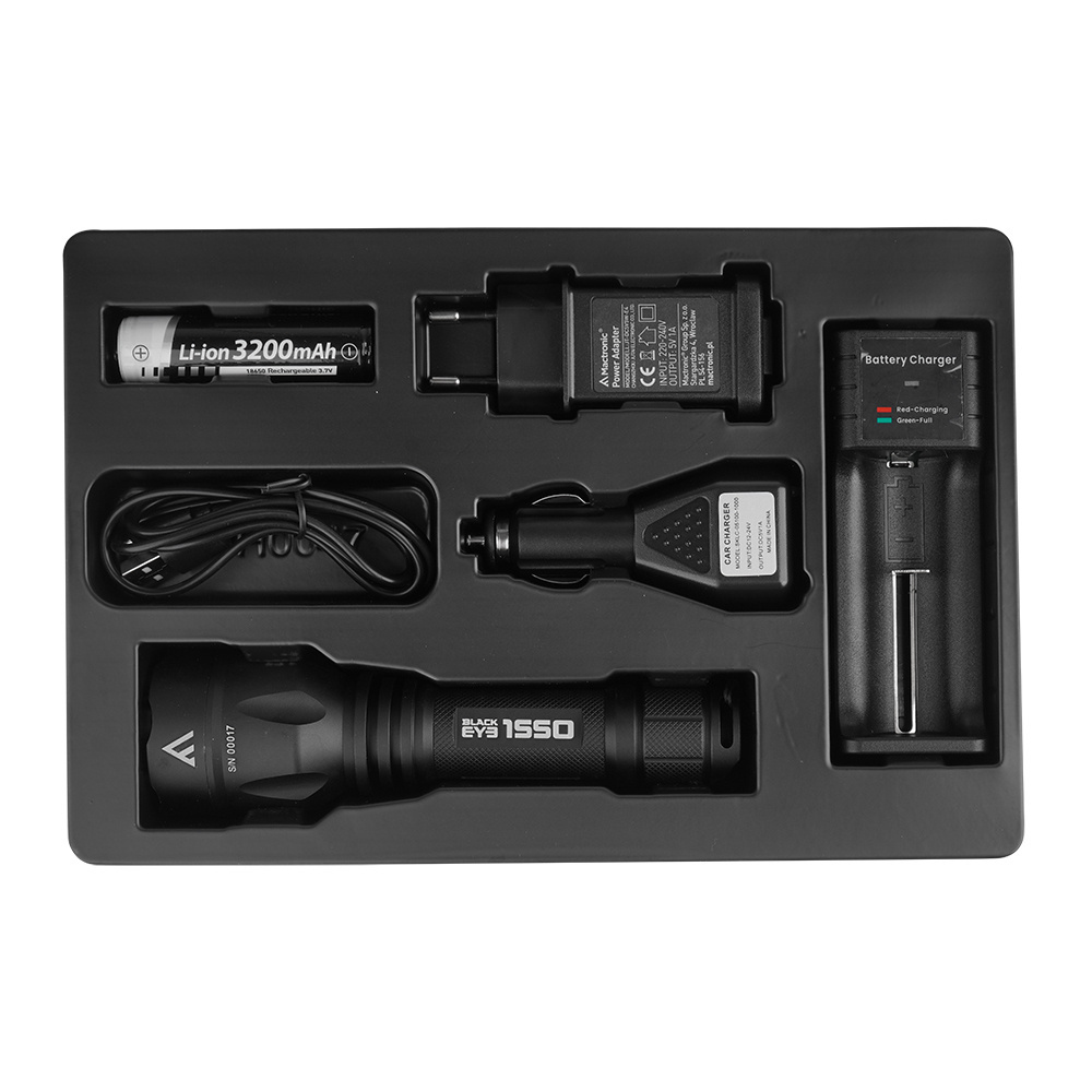 The Black Eye 1550, the successor to the Black Eye XM-L U2 LED MX142L-RC, is a highly effective Mactronic® battery-powered handheld flashlight. This model features a durable aluminum housing, drop resistance (from 1.5 meters) and IP65 certification, so it can withstand the toughest working conditions. The flashlight is very versatile and can be used as a piece of personal equipment or for other tactical and patrol applications.