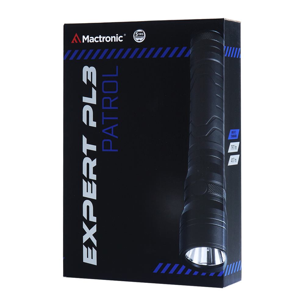 Rechargeable flashlight with a power of 797 lm, designed to equip the police and security personnel. Aluminum construction, covered with a layer of rubber, fits well in the hand. Resistant to immersion, dust, and dirt. Charging via a magnetic cable that can be connected to a wall plug or USB input. The set includes a wall or car holder.