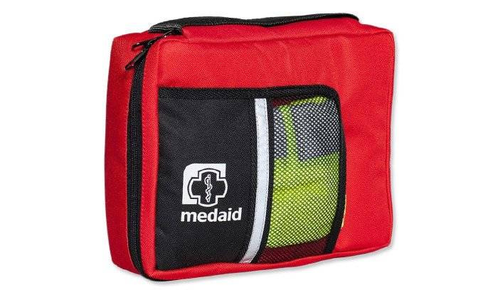 Comes with saline solution and Oropharyngeal airway, reflective vest and chemical light. Its equipment allows you to take action in case of: cardiac arrest, injuries, lacerations, eye injuries, head injuries, dislocations, sprains, fractures, hypothermia.