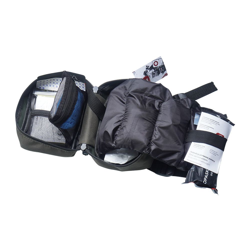 Tactical first aid kit equipped with a set of dressings. The equipment allows you to stop bleeding, open the airways or dress a cut. The interior has special compartments, thanks to which the equipment is always organized. The first aid kit is made of durable and waterproof Cordura, which protects the contents from damage.
