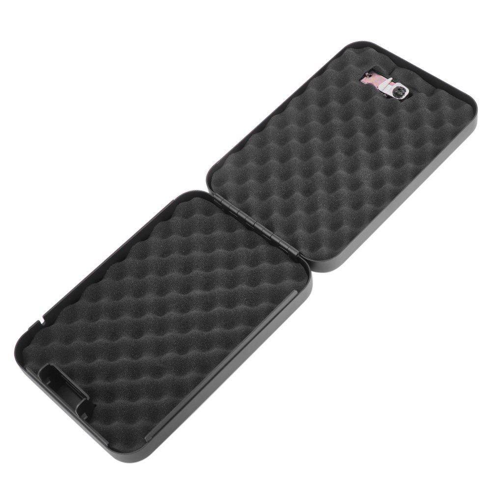 The inside of the case is covered with soft foam. The case has a lock with 3-digit code. Through to the two holes in the back the case can be screwed to a surface of your choice or you can use the steel cable attached with a length of 90 cm, which will protect against theft.