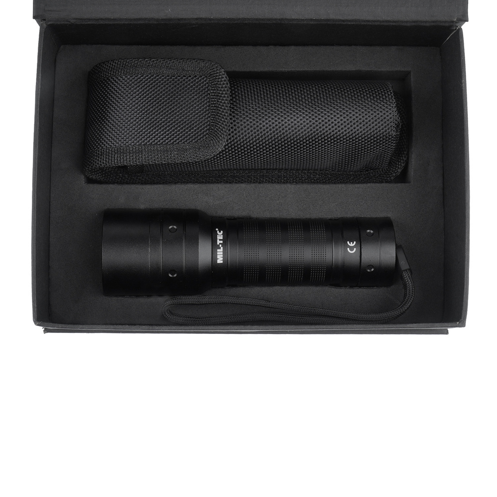 The flashlight is packaged in a stylish gift box closed by a flap with a magnet. Inside it is lined with foam with a cutout for the set elements. The flashlight comes with a wrist thong and a Velcro flap closure pouch, equipped with a belt loop with a maximum width of up to 70 mm.