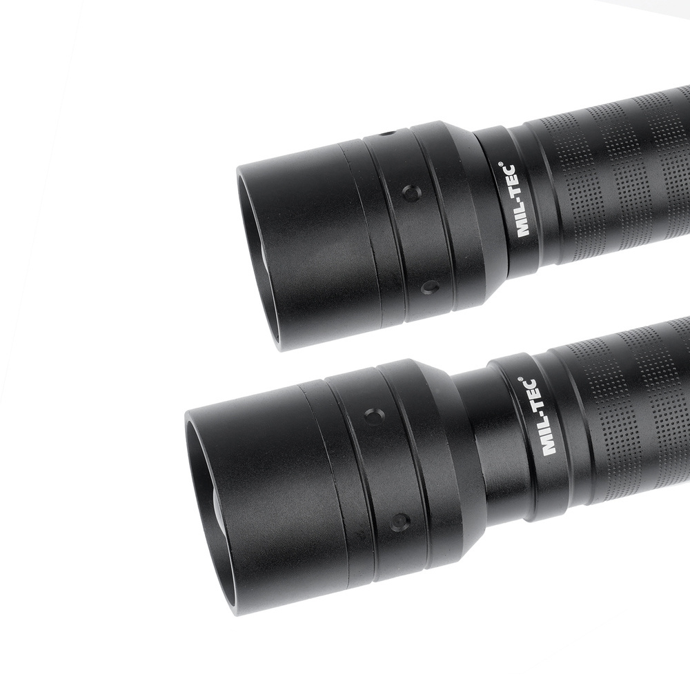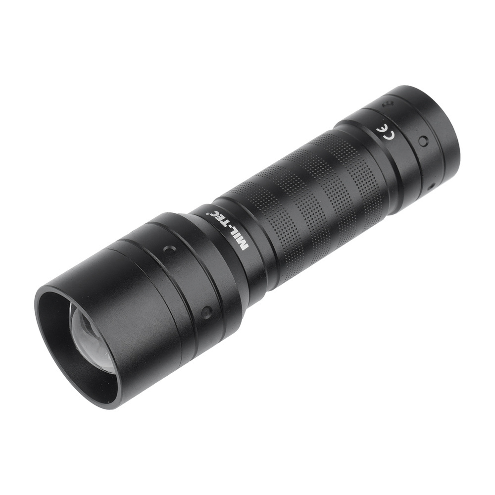 The aluminum body is IPX4 rated. It is covered with a non-slip texture for a secure grip even with wet and dirty hands. The flashlight has a focus function, accessible by extending the head.