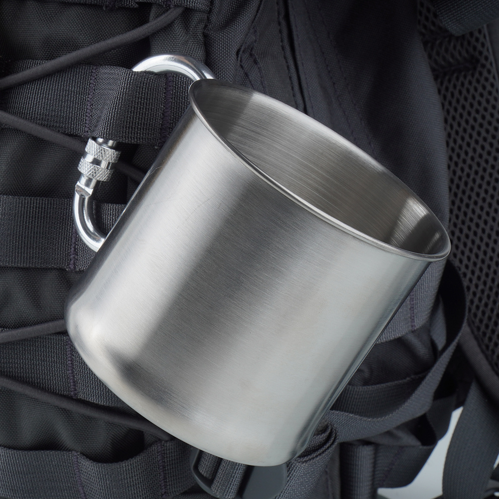 A mug made of stainless steel, additionally equipped with a carabiner eye, which allows it to be attached, for example, to a backpack.