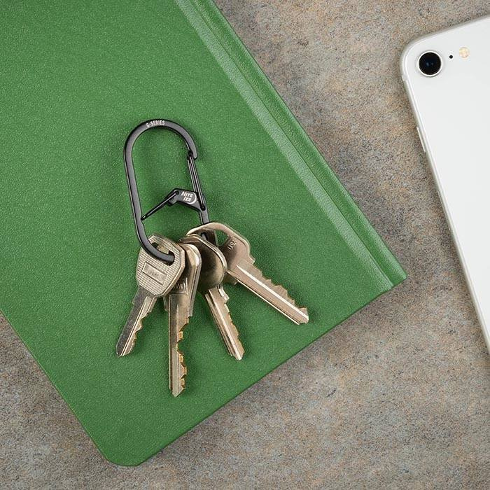 Made of steel carabiner with double chamber. When the first compartment is opened, keys and hanging accessories are still safe thanks to the closed second compartment. Set of two carabiners.