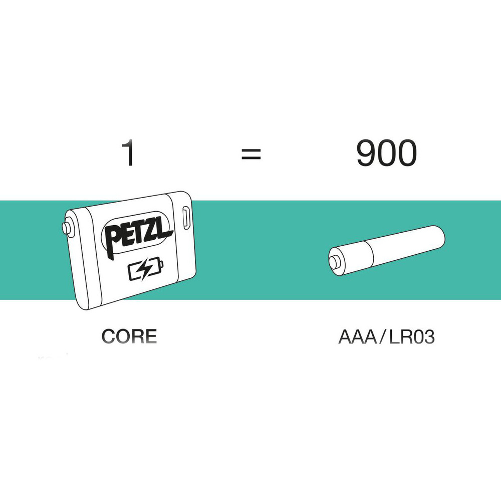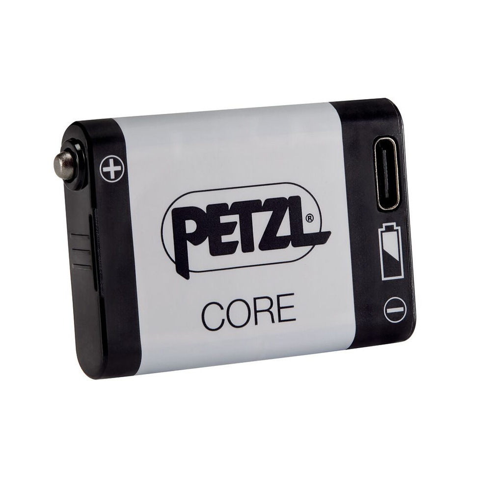 CORE 2 rechargeable lithium-ion battery with a capacity of 1250 mAh for Petzl flashlights. The design of the battery resembles a combined pack of three AAA batteries with the difference of a clearly visible USB-C charging port. Next to the port is the battery symbol under which a charging indicator in the form of an LED is placed. The battery pack is compatible with Petzl headlamps using the Hybrid Concept system, including the Iko, Actik, Aria, Tikka, Tikkina, Tikkid models.