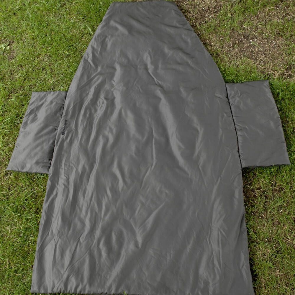 The quilt's dimensions allow it to comfortably cover the entire body. Side flaps and a leg pocket help keep the quilt in one place preventing it from slipping off. The included compression pouch allows you to reduce the size as much as possible when packed, making it easier to transport in a backpack.
