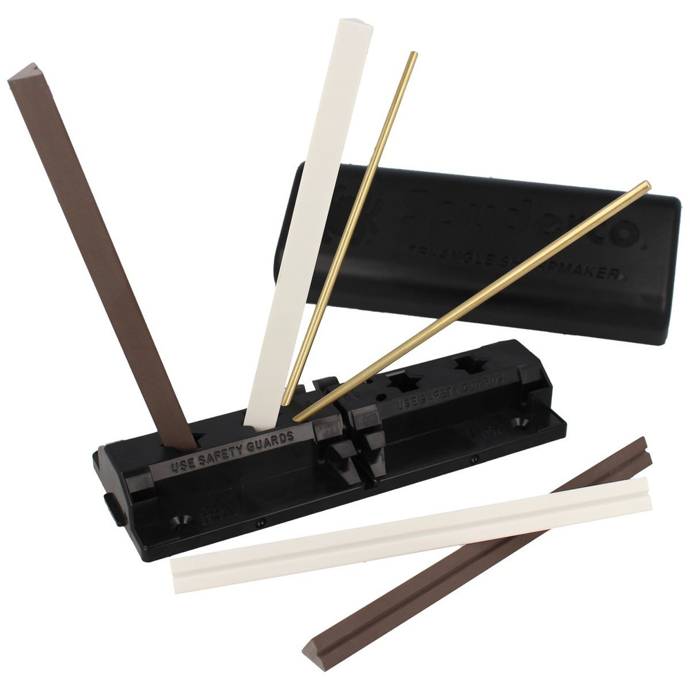 The Tri-Angle Sharpmaker includes two sets of high alumina ceramic stones: A pair of medium-grit (brown) stones for aggressive sharpening and a set of fine (white) stones for professional grade finishing. The stones are triangular for sharpening Plainedges on the flat sides and SpyderEdges (serrations) on the corners. A furrow running the length of each stone lets you sharpen pointed items like fishhooks, darts and awls. Included is a set of brass safety rods protecting the users hands while sharpening. All components snap into the self-contained ABS plastic base and lid -- ready to travel with you. Die-cut into the base are keyed slots and holes fitted for the stones. They accurately set the stone's sharpening angle at a 30° (15° each side) or 40° (20° each side) for knives and a 12.5° scissor setting. Turn the base over, a channel lets you lay two stones side-by-side (flat-side up) for use as a benchstone. The lid snaps halfway over the base creating a handhold for stability while you're sharpening. Included is a set of brass safety rods to protect the users hands while sharpening. Ceramic stones, like glass, will break if dropped -- handle carefully. Use them dry, without oil, water or lubricants. To clean: scrub stones with a plastic scouring pad and powered abrasive cleaner, let air-dry. Also autoclave safe. System comes with instruction book and DVD.