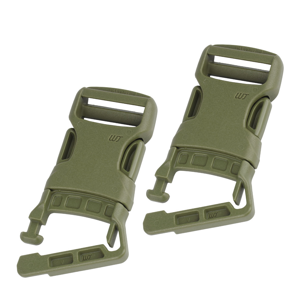 A set of two universal buckles. Depending on your needs, they can be used as a replacement item or be used to mount additional equipment. The holes allow the use of various types of trousers and straps up to 25 mm wide. The female part of the buckle has a clip compatible with the MOLLE system, which allows you to attach them to a tactical backpack.