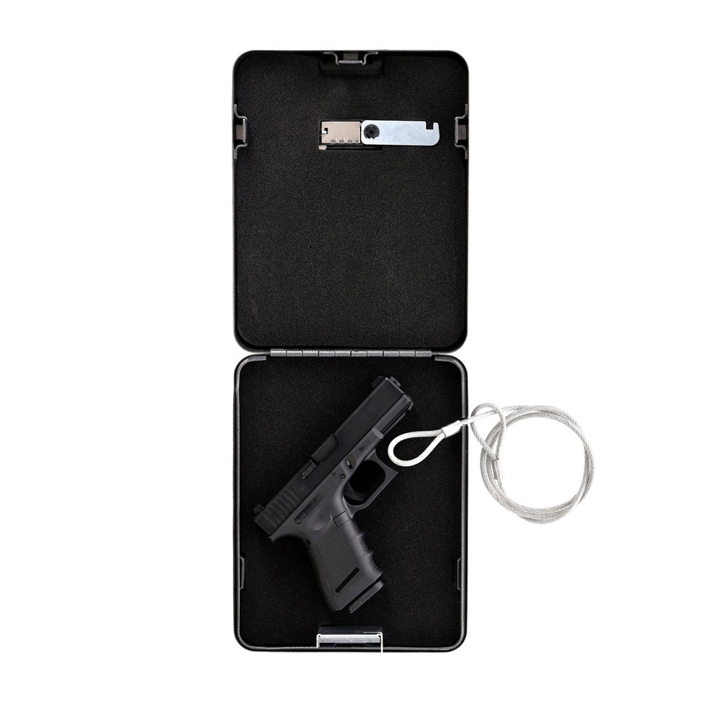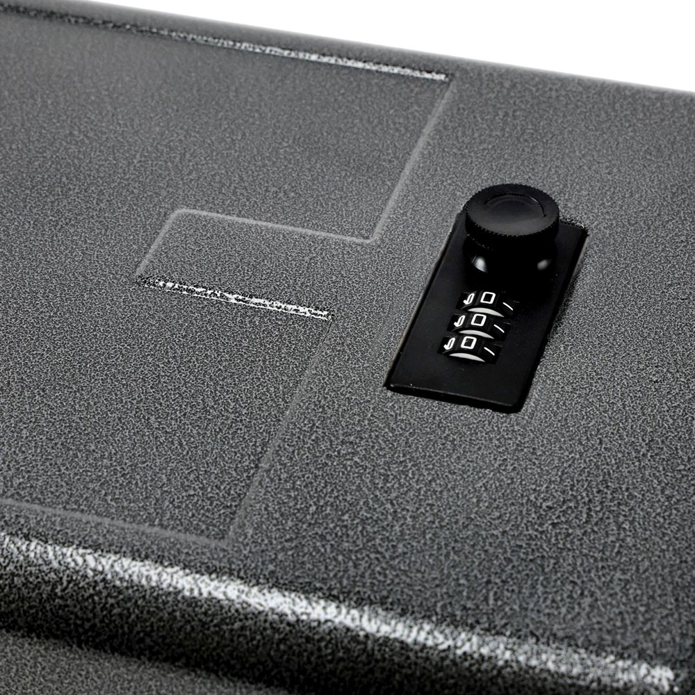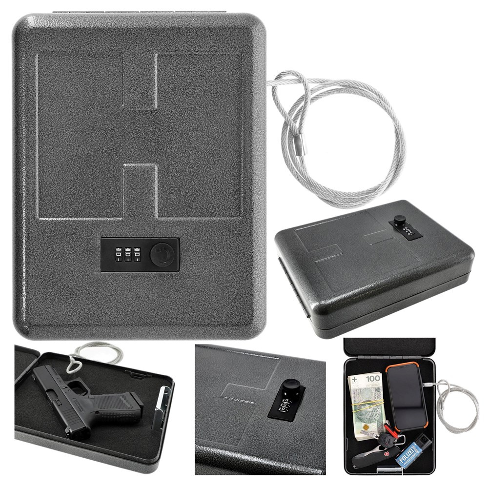 Umarex Safety Box L is a small safe that allows you to store all your valuables conveniently and in one place. The safe is locked with a 3-digit combination lock, equipped with a steel cable of about 90 cm in length, allowing you to attach the Safety Box securing it against theft. The safe is entirely made of steel coated with black powder paint, and the interior is padded with foam to protect the stored contents from damage.