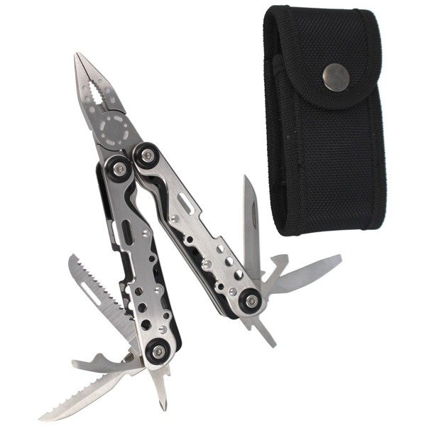 Narzędzia: Kombinerki, przecinak, nóż gładki, nóż ząbkowany, piła, pilnik, otwieracz do butelek, otwieracz do konserw, klucz płaski, klucz krzyżakowy