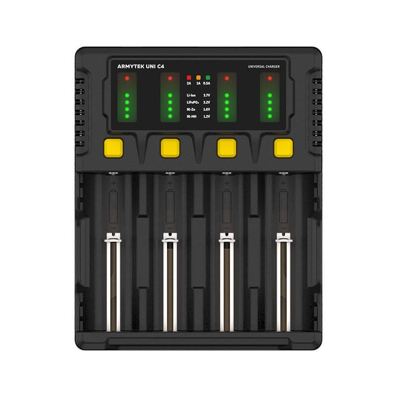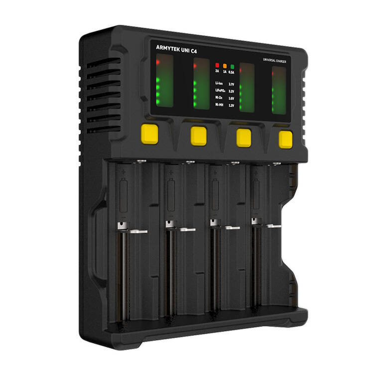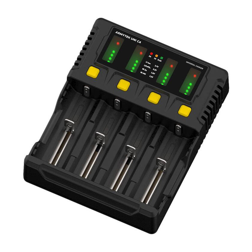 Osprzęt ładowarki posiada niezależny system kontroli negatywnej delty V. Wykrywa on zmianę napięcia w naładowanym ogniwie akumulatorowym, dzięki czemu automatycznie zakańcza proces ładowania. Poza tym posiada inne czujniki, które również mogą zadecydować o zakończeniu ładowania. Ładowarka Uni C4 pozwala na ładowanie do 4 akumulatorów jednocześnie.