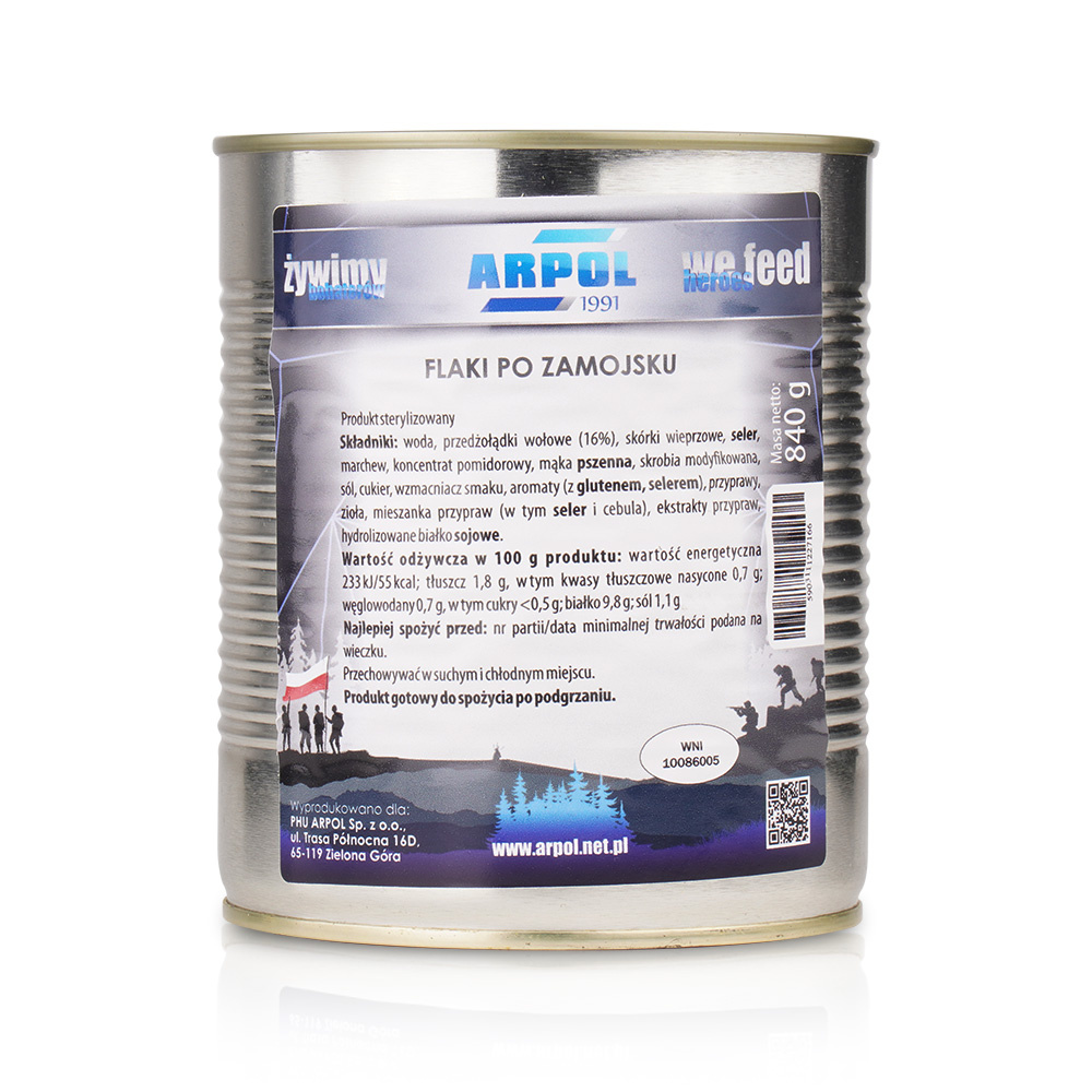 Pojedyncza puszka ze sterylizowanym posiłkiem w formie zupy, gotowej do spożycia po podgrzaniu od firmy Arpol. Puszka w której posiłek jest hermetycznie zamknięta, korzysta ze standardu EO - Easy Open. Standard ten oznacza, że puszka posiada na wieczku zawleczkę, dzięki której można je oderwać bez użycia dodatkowych narzędzi. Po przygotowaniu zupy warto ją przelać do naczynia turystycznego, aby móc ją komfortowo spożyć.