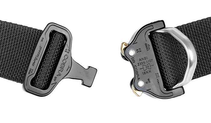 - Klamrę ratunkowo-asekuracyjną COBRA ANSI D-RING firmy AustriAlpin o podwyższonej specyfikacji. Jest ona wykonana z aluminium 7075 (korpus), stali nierdzewnej (piny, belka zaciskowa) oraz mosiądzu (uszka). Wytrzymałość klamry na zerwanie wynosi aż 18 kN (ponad 1800 kg) oraz 36 kN w pętli, pod warunkiem zastosowania odpowiedniej taśmy. Mechanizm klamry uniemożliwia otwarcie pod obciążeniem.